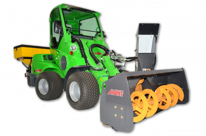 When combined with the articulated compact loader, it makes snow removal easy in tight spots. The new hitch adaptor on the back allows for a salt spreader to be used in conjunction with the blower. The Avant 750 with DLX cab is road-ready and includes heat for those cold winter days.